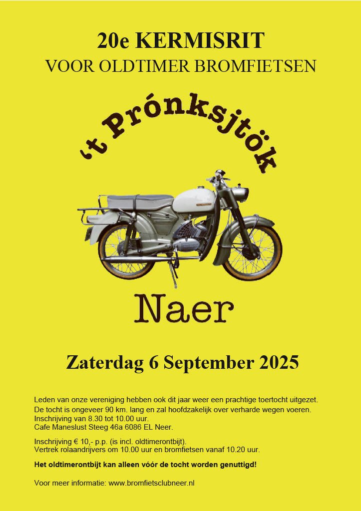 Het jubileumjaar wordt bekroond met een bijzonder evenement: op zaterdag 6 september vindt de twintigste editie van de kermisrit plaats. Wat ooit begon als een spontane rit door het dorp, is uitgegroeid tot een groot evenement met nationale én internationale bekendheid onder oldtimerliefhebbers.